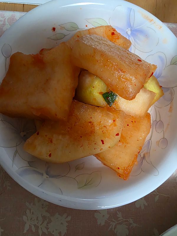 아삭아삭 맛있어요 생무는 매워 못먹는데 살짝 익어 정리하며 입에 물고 있네요~