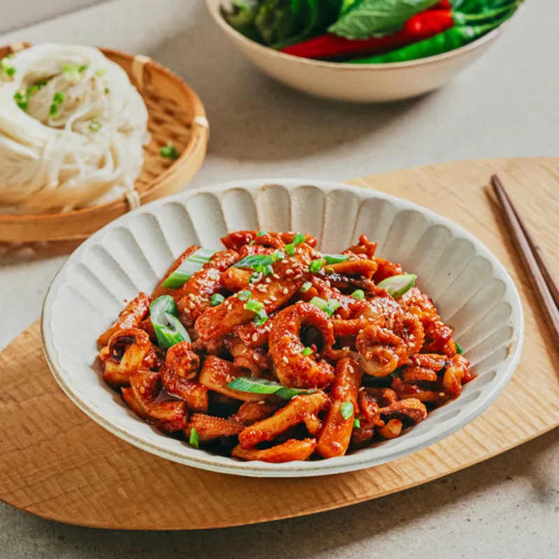 양념에 버무려진 갑오징어만을 가득 담아 보내드려요. 취향에 따라 냉장고 속에 잠들어 있던 면이나 대패 삼겹, 떡을 곁들여 더욱 다채롭게 갑오징어 볶음을 즐겨보세요.