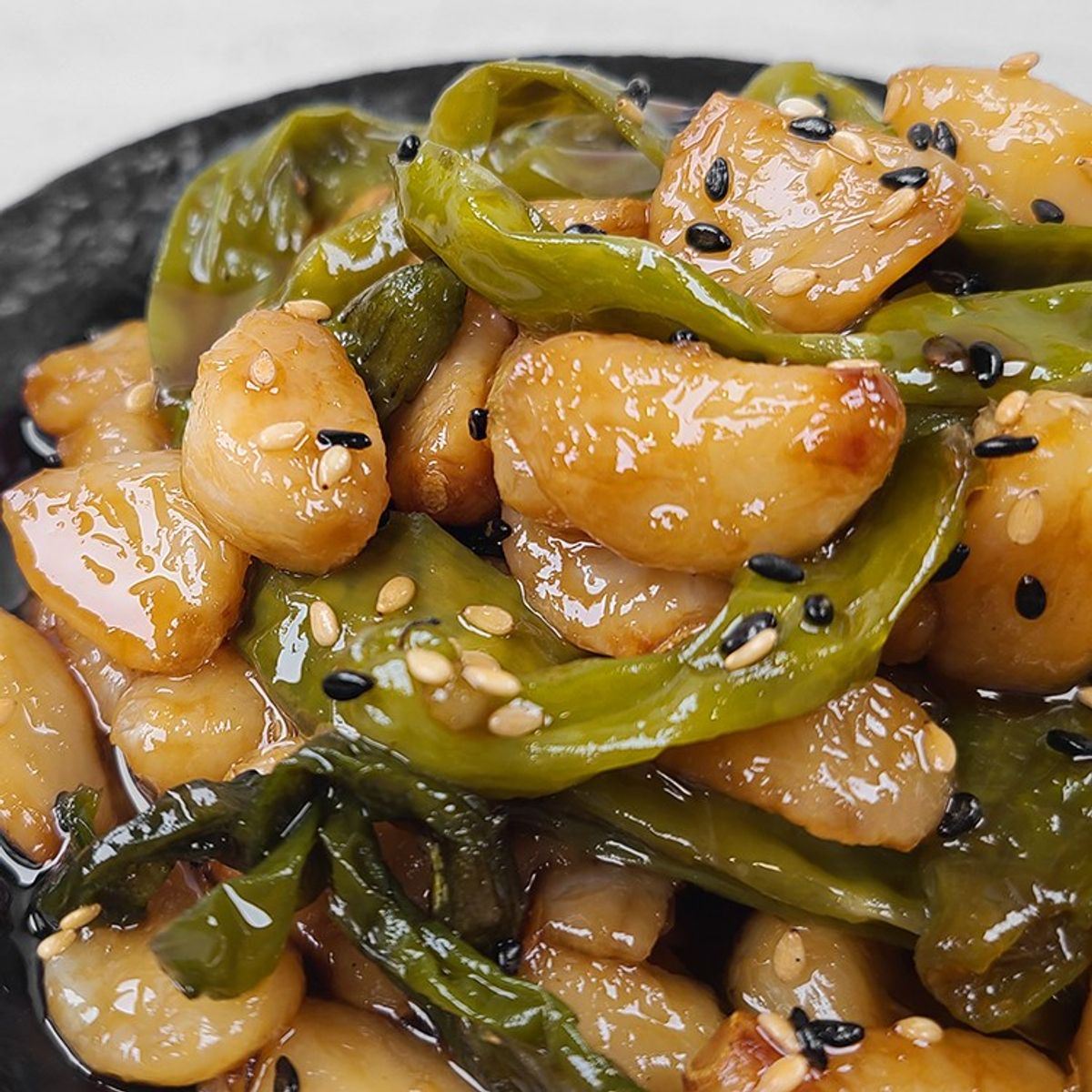 통마늘을 노릇노릇할 때까지 달달 볶아 아린 맛은 날아가고 고소한 풍미만 남았습니다. 적당한 맵기의 꽈리고추까지 더해 감칠맛 도는 밥반찬이 완성되었어요. 수제로 만들었기에 자극적이지 않습니다.