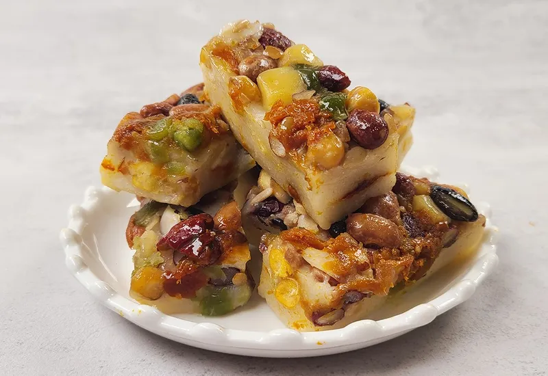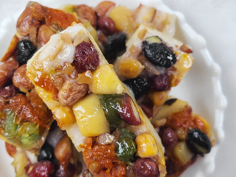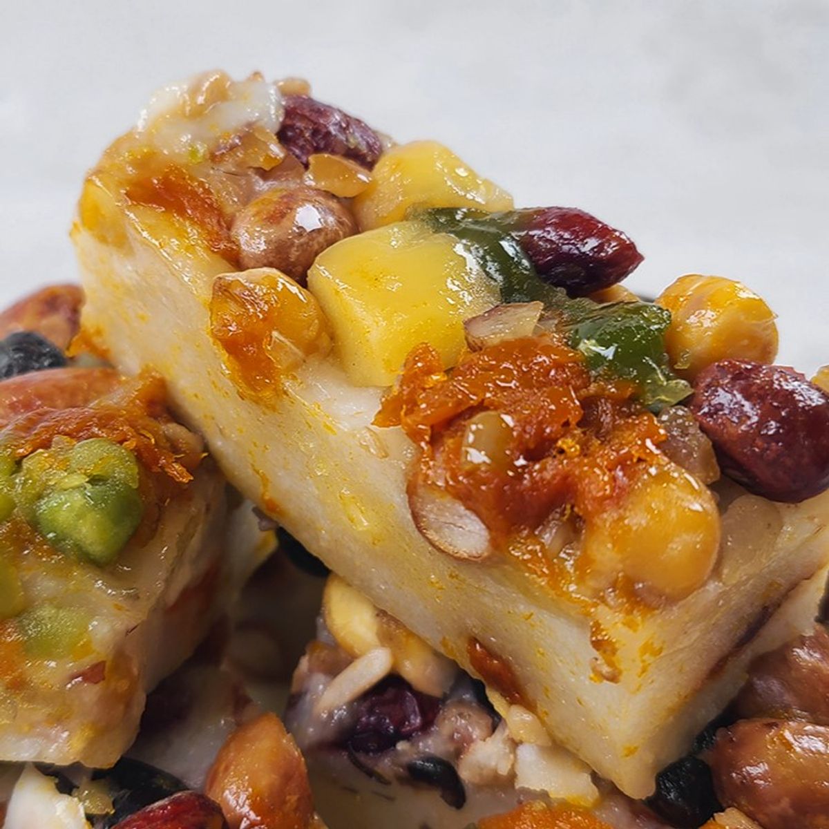 신선하고 쫀득한 국내산 찹쌀과 전남 신안 해수로 건조한 천일염으로 만든 떡입니다. 그 위에 곡물·견과·과채로 식감과 맛을 한 번에 잡았습니다. 호두, 해바라기씨, 호박씨, 아몬드, 땅콩, 완두 등으로 쫀득 오독한 식감을 자랑해요.