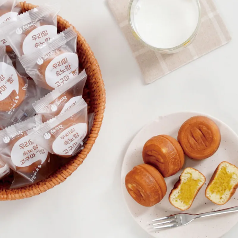 우리 밀로 만든 촉촉한 빵 속에 고구마 앙금을 듬뿍 넣었어요. 고구마를 쪄낸 후 으깨 만든 앙금이라 많이 달지 않답니다. 당에 부담이 있는 분들도 거부감 없이 드실 수 있어요.