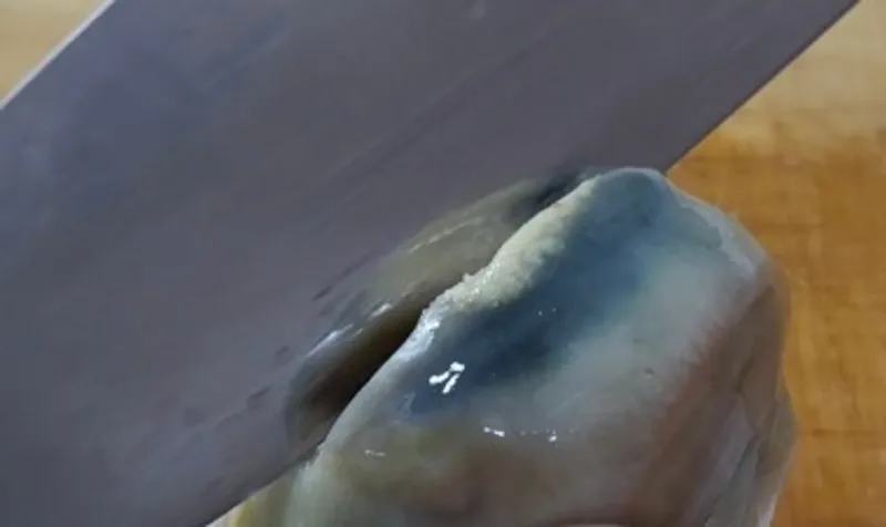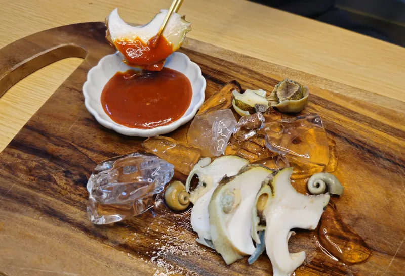 참소라는 쓸개 쪽에서 쓴맛이 많이 납니다 조리 후 푸른빛을 띄는 쓸개 부위를 칼로 제거하여 드시길 바랍니다.