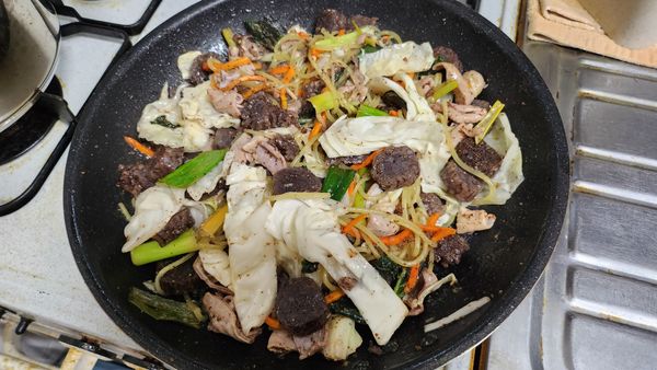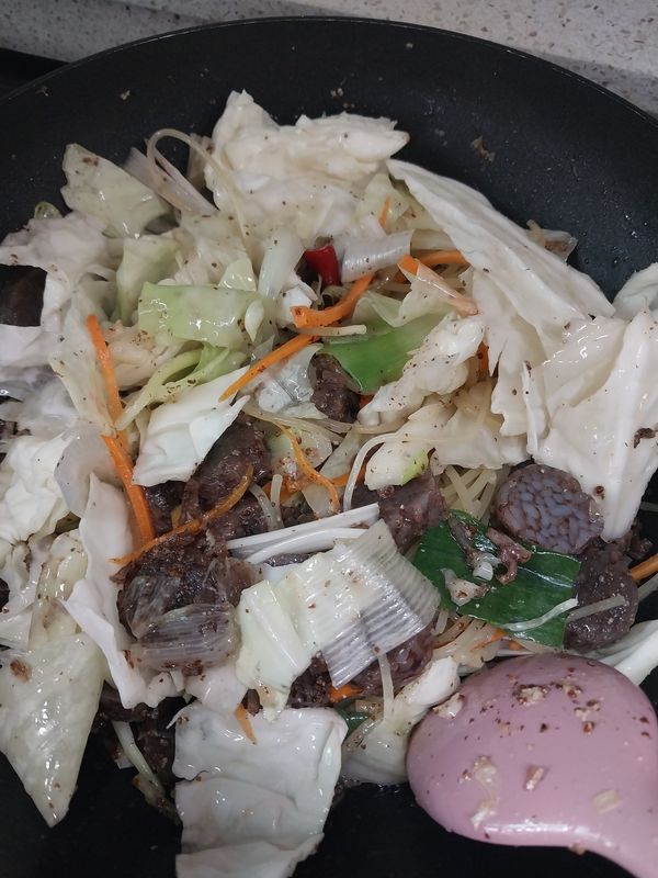 밖에 비는 내리고요 신림동 순대볶음 아주 좋네요 채소도 듬뿍 쫄면도 들어있어요 맛은 짜지 않아요 담백하고 밥대용 충분합니다