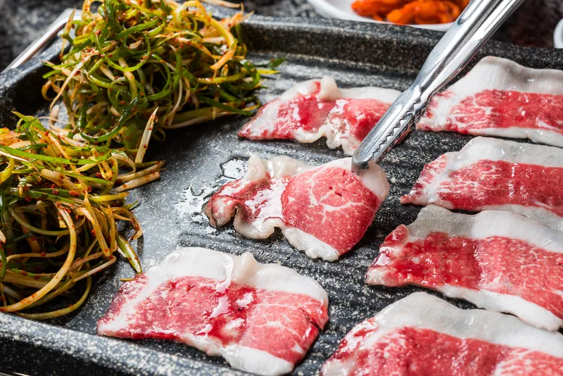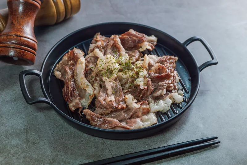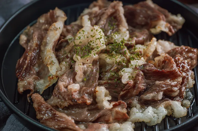 차돌박이는 센 불에 짧게 구워 먹는 게 제맛! 한 점씩 불판에 올려 구워내면 고소한 향이 입맛을 확 끌어올려요.