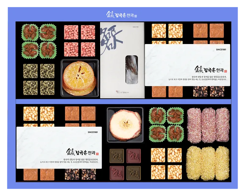 [약과] 꿀약과 / [유과] 백련초, 단호박 / [강정] 백련초, 현미, 쑥, 흑미, 호두 / [다식] 녹차,백련초 / [정과] 사과, 오렌지, 도라지 구성입니다.