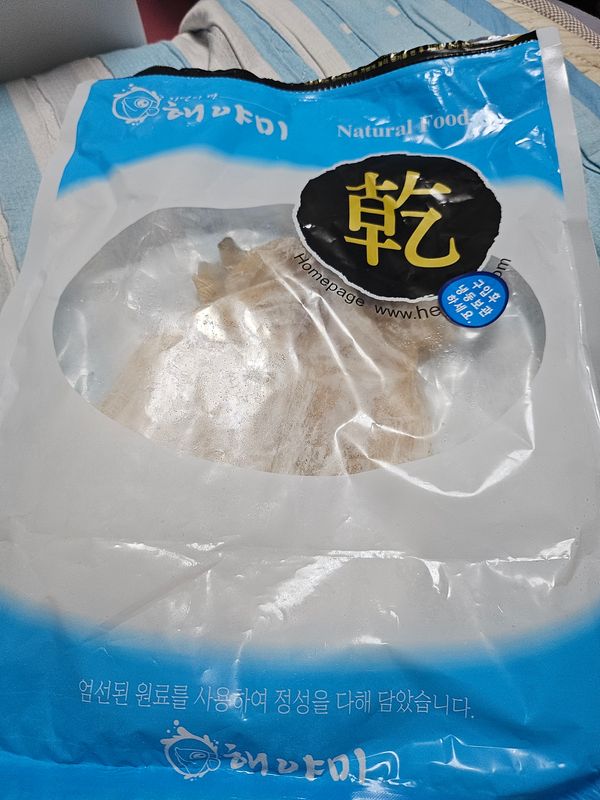 마른오징어 몸통보다는 조금 반건조 같아요~ 그래서 그런가 그냥 먹기 심심하고 오징어 맛이 덜해요 그리고 약6마리라고 했는데 두봉다 사이즈가 작은8마리네요