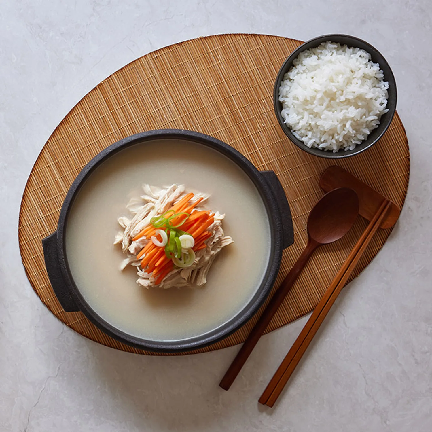 충남 당진 전통시장에서 운영 중인 전문점에서 직접 만듭니다. 신선한 닭을 당일 손질해 삶지 않고 찌는 전통 방식으로 조리하며, 진짜 사골을 고아 낸 육수만을 사용해 깊고 진한 국물 맛을 완성합니다.