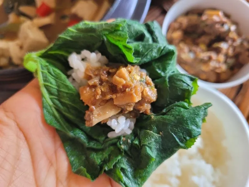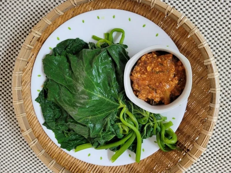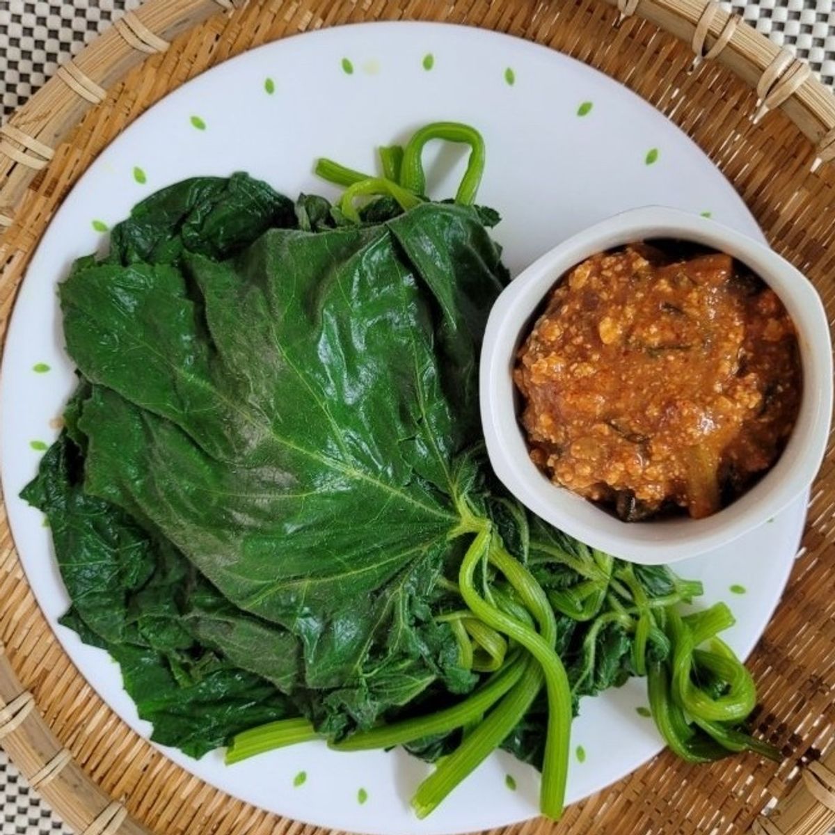 정성껏 삶아낸 조선 호박잎에 알싸한 땡초 비빔된장을 곁들여보세요. 구수함과 매콤함이 어우러진 최고의 밥반찬이 된답니다.