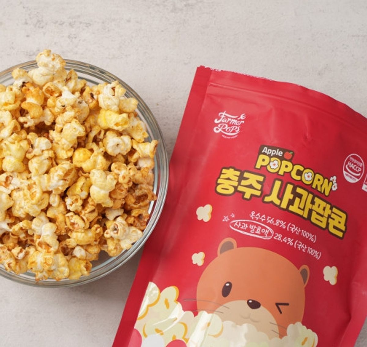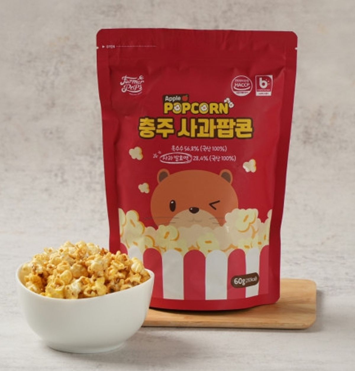 파머팝스팝콘은 팝콘옥수수와 농산물 발효액, 국산 천일염, 야자유 외에는 화학첨가물을 넣지 않고, 유전자 변이(GMO) 옥수수가 아닌 충주 농민들이 재배한 토종 팝콘 옥수수만을 사용하여 자극적이지 않고 자연스러운 달콤함과 고소함이 특징입니다.