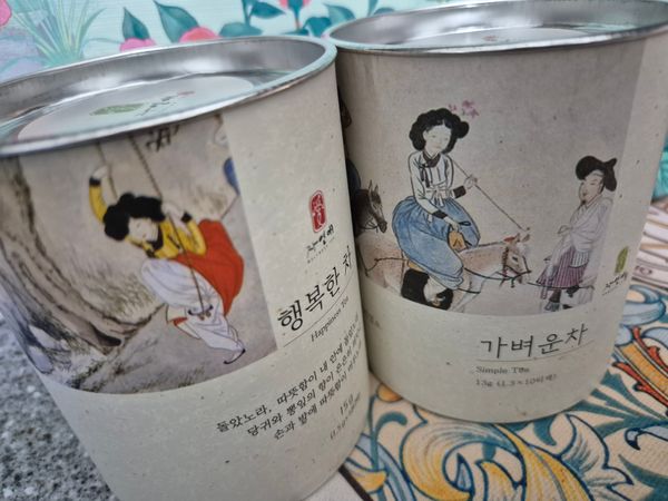 행복한차는 당귀랑 뽕나무잎으로 구성된차로 약간 한약향도 있어서 겨울차 느낌였어요. 가벼운차는 청량감과 고급진 은은한 맛으로 보통때 즐기기 좋을듯해요. 선물용으로도 참좋습니다.