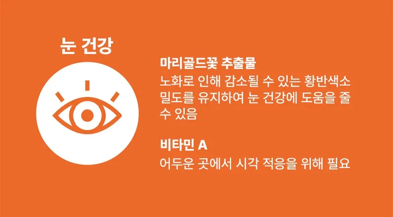눈 건강에 도움을 줄 수 있는 추출물인 마리골드꽃추출물을 20mg 함유하고 있습니다.