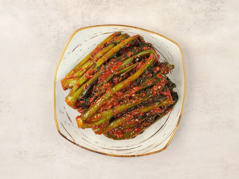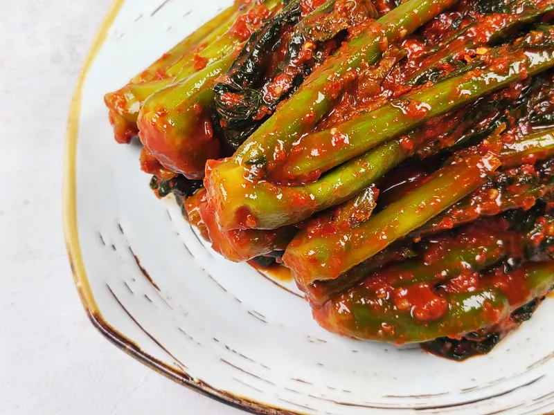 특유의 톡 쏘는 매운맛과 꼬들꼬들하면서 아삭한 식감이 매력적인 갓김치예요. 갓 지은 따뜻한 밥위로 싸 먹어도 맛있지만, 기름기가 많은 고기와 함께 곁들여 먹어도 정말 맛있습니다 :)