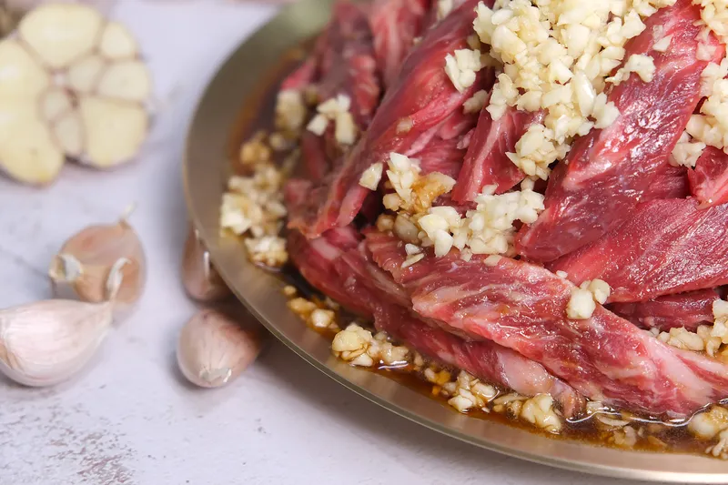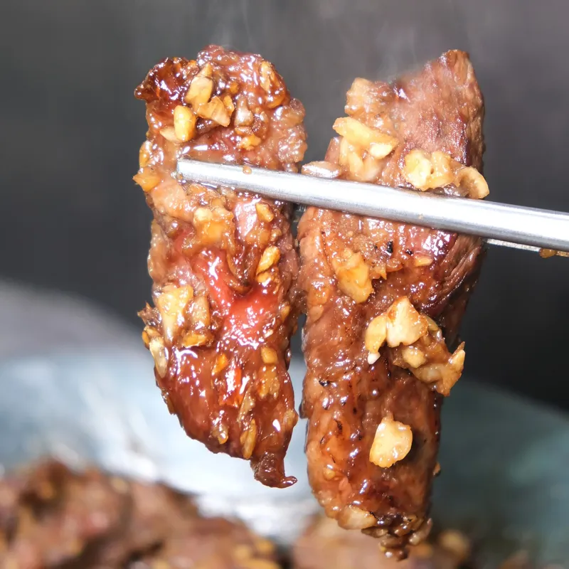 프리미엄 소갈빗살에 향긋한 100% 국내산 다진 마늘을 더했습니다 간 마늘보다는 시간이 더 들어도 정성스럽게 다진 마늘은 향이 오래 지속되고 식감이 있어서 감칠맛과 풍미가 일품이에요.