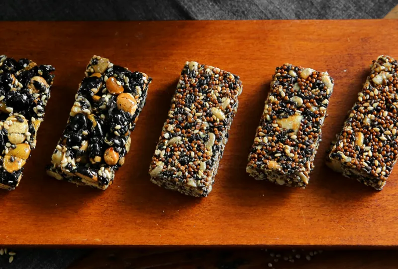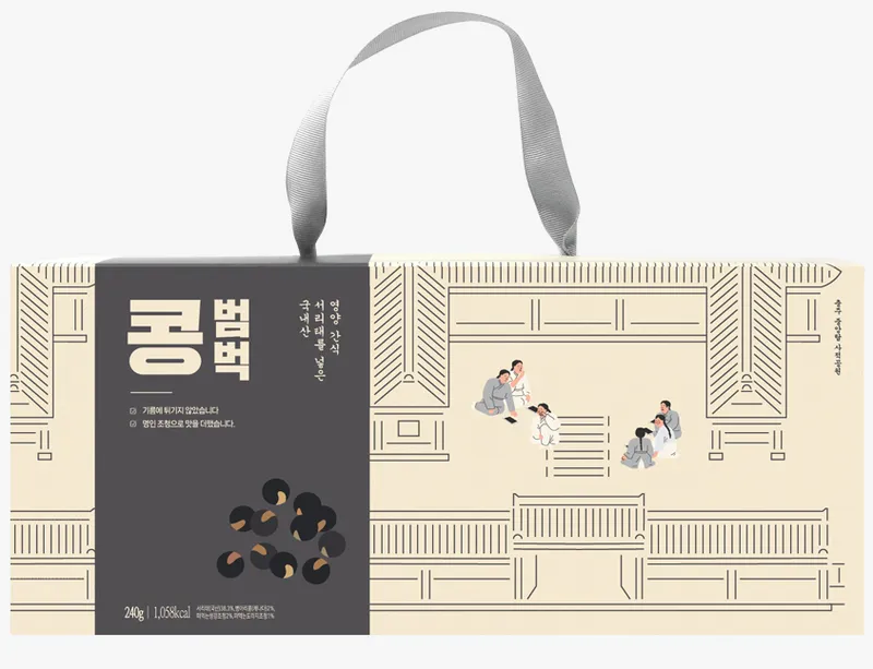 국내산 서리태콩에 호두, 흑기, 흑임자깨, 참깨, 병아리콩을 더해 명인의 조청으로 건강한 단맛을 낸 영양바입니다.