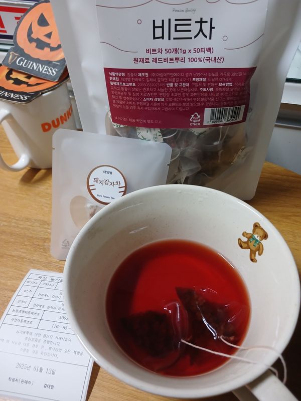 비트차는 아직 안 먹어보고 서비스로 온 돼지감자차 먹어봤는데 고소하니 너무 좋아요 비트차도 기대가 됩니다