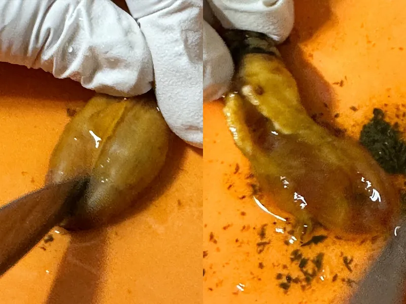 미더덕에 살짝 칼집을 내어 칼등으로 살짝 밀어내면 뻘이 나옵니다. 그것만 제거하시고 흐르는 물에 살짝만 헹궈주세요. 단, 많이 헹구면 향이 날아가요.