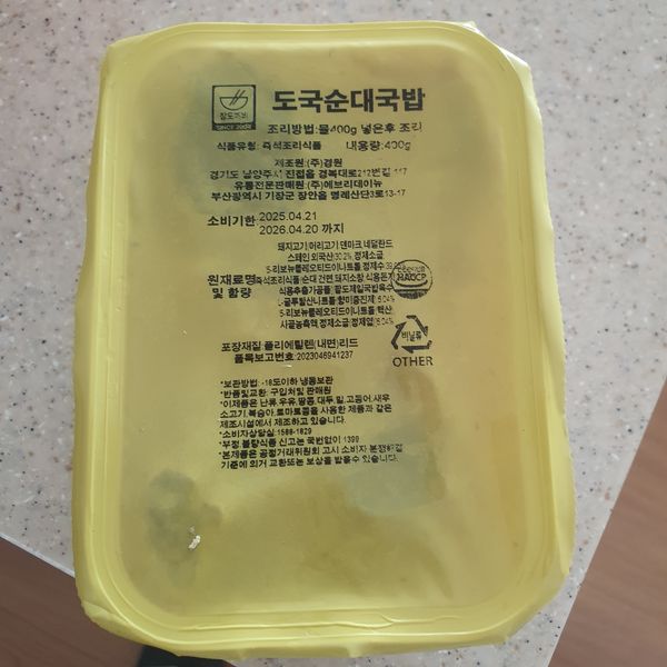 처음에 받았을때 너무 작은 통에 담겨있어서 깜짝 놀랐는데 물을 넣고 끓이는거더라구요. 순대는 딱 3개 들어있고 머리고기가 많이 들어있어요. 그리고 조미료맛이 좀 강한게 저는 별루 였는데 아들과 남편은 맛있데요.