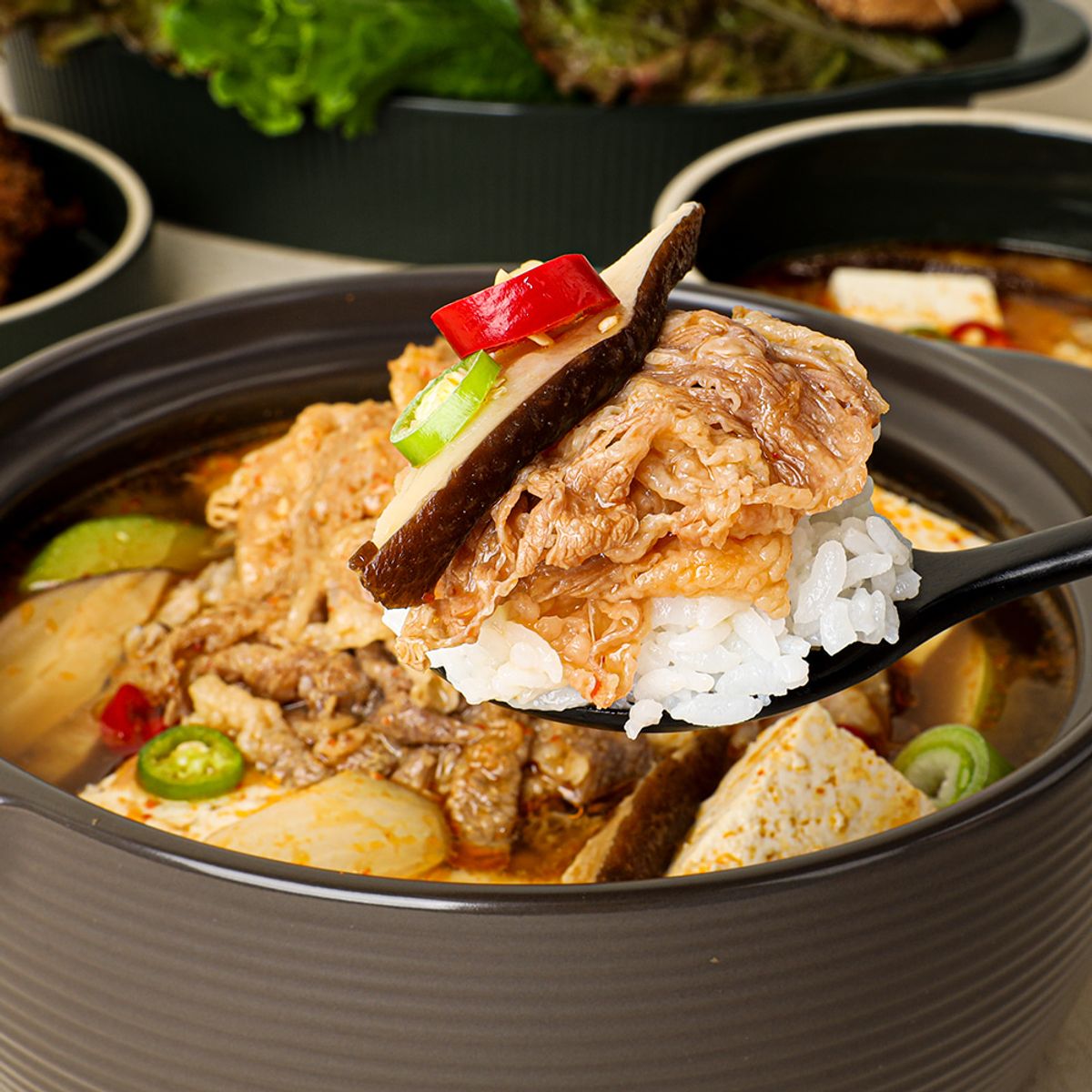 씹을수록 고소한 차돌과 구수하고 짭조름한 된장의 조화! 고깃집에서 먹던 된장찌개처럼 감칠맛이 훌륭해요. 국내산 무, 대파, 양파, 표고버섯, 밴댕이 등 다채로운 재료를 넣어 시원함과 풍미까지 더했습니다. 고추와 고춧가루를 살짝 더해 밥 비벼 먹기 좋은 은은한 칼칼함까지 놓치지 않았어요.