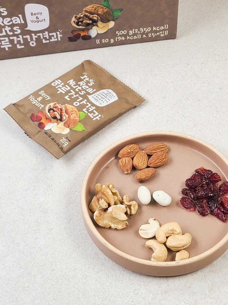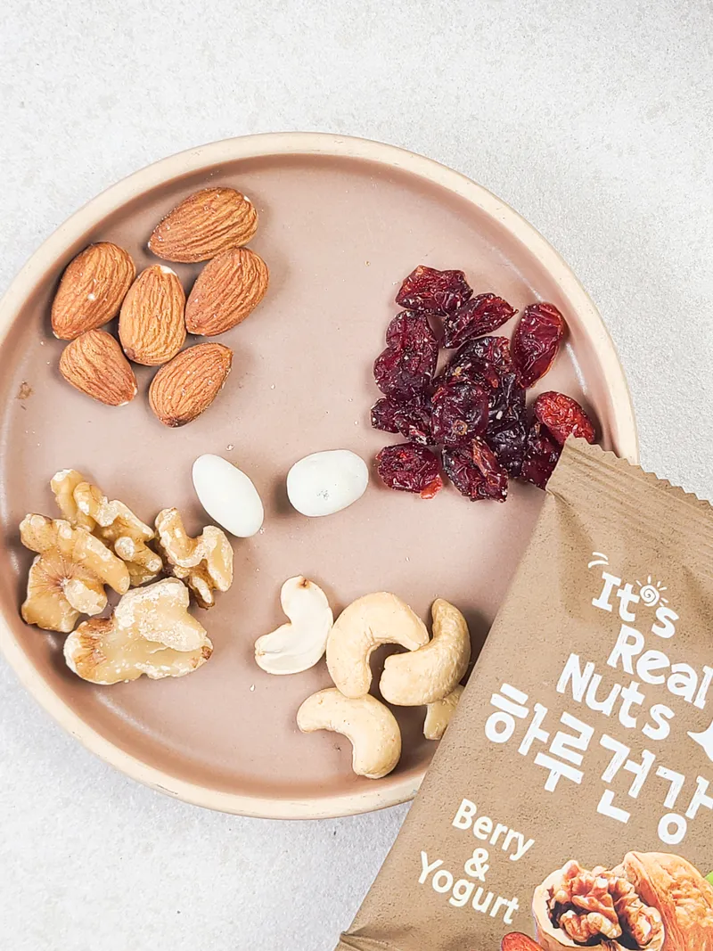 구운 아몬드, 호두, 구운 캐슈넛, 요거트 레이즌, 건조 크랜베리까지 총 5가지 재료를 골고루 담았어요. 5가지의 다채로운 맛과 식감을 느껴볼 수 있습니다.