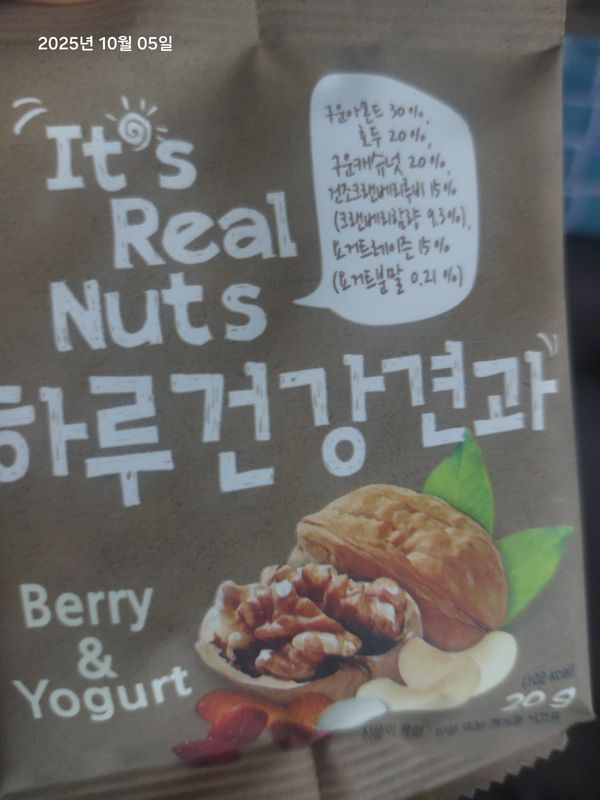 견과류가 한 봉지에 다양하게 들어 있는걸 좋아해서 자주 먹는 간식이에요. 이 제품은 다섯가지 종류가 믹스가 잘 되어 있어요. 적당히 달달하게 요거트도 있고 베리도 있어서 식감에 맛까지 잘 챙겼어요. 너무 좋았어요. 네가족이 하루 한개씩 먹으니 순식간에 없어지네요~^^