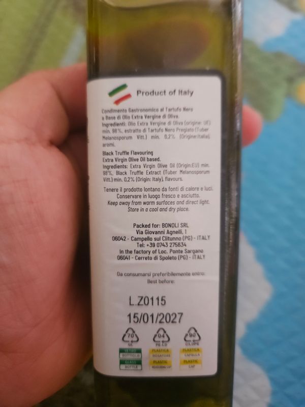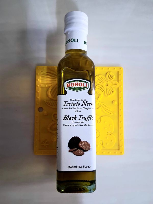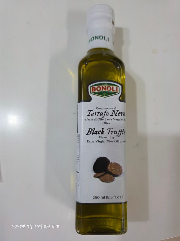 올리브오일 좋아해서 이것저것 구입해보는데 보오리 블랙트러플 엑스트라버진 오일은 처음 맛봅니다. 이탈리아산이라 신뢰가 가고 양도 250미리 적당하고 좋습니다. 트러플 조각이 들어가있지는 않아 조금 아쉽지만 , 향은 충분합니다. 만족스러워요!!