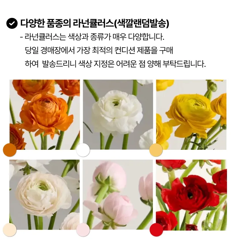 5송의 라넌큘러스가 한 묶음으로 구성되어 있으며, 색상은 랜덤으로 배송돼요. 신선한 상태로 관리되어 받으신 후에도 오래 감상할 수 있어요.
